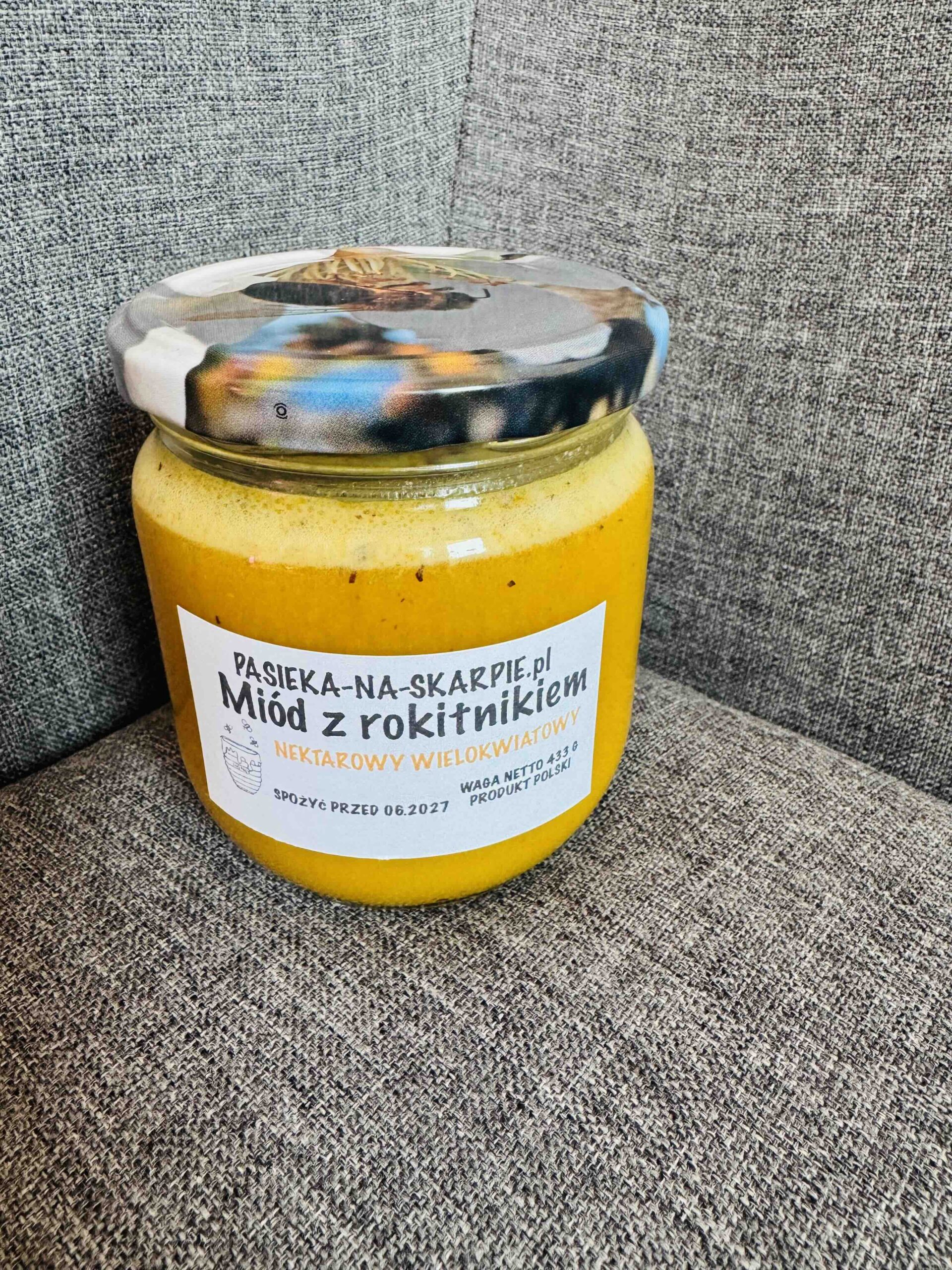 Miód leśny z rokitnikiem 2025 to wyjątkowe połączenie miodu leśnego kremowanego i owoców rokitnika. Ostra słodycz miodu zbalansowana kwaskowatością rokitnika. Odurzający aromat owoców zatopionych w miodzie rozkosznie tańczy na języku. Całość dopełniają zdrowe, chrupiące nasiona rokitnika — cenne i bogate źródło nienasyconych kwasów tłuszczowych omega-3, witamin i steroli roślinnych.